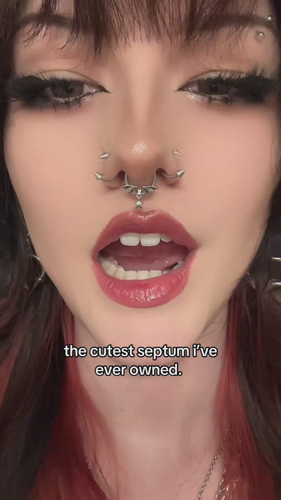 This is a mesmerizing accessory that combines celestial charm with gothic flair. This star dangle bat septum ring features a pair of elegantly detailed bat wings that gracefully frame a dangling star charm.