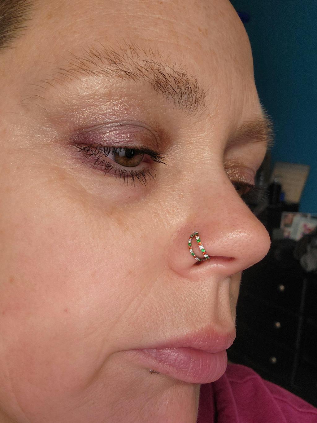 The Christmas nose ring is paved with vibrant red CZ gems paired with sleek green ones create a striking contrast. This beauty comes in sizes from 6 to 8 inner diameters, so you can definitely find your perfect fit! The hinged segment hoop design is super easy to wear, which is a huge plus.