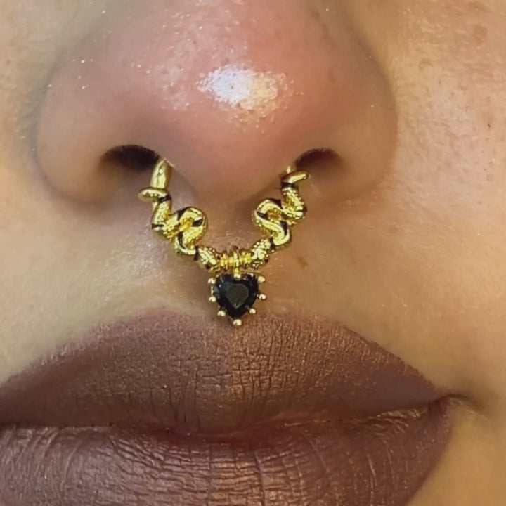 A top-notch design conveys a certain feeling strongly without words, just like this gorgeous snake septum ring claims almighty power quietly. The gold and black classic due glimmers brightly with grace. The movement towards the heart at the center is graceful and inviting. Also as an ancient emblem of various cultures, the snake represents rebirth, transformation, immortality, and healing. You know you're powerful, so check this one and claim this mesmerizing septum ring.