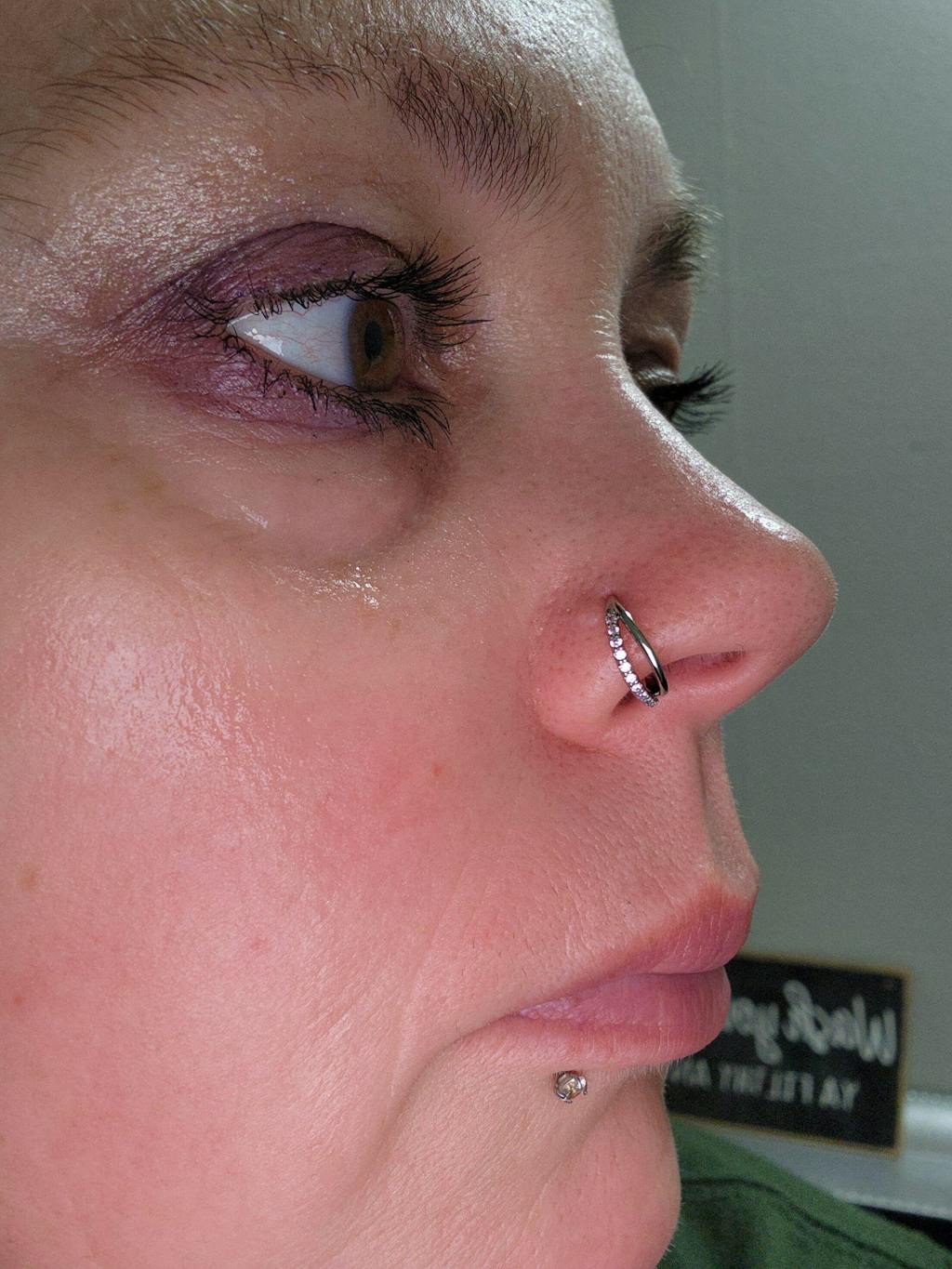 This seamless nose ring features a unique twisted design that adds a contemporary flair to its classic hoop shape. Adorned with sparkling cubic zirconia stones on one half and a clean line on the other, this piece delivers a dazzling and eye-catching effect. The meticulous craftsmanship ensure durability and a comfortable fit. Perfect for those who appreciate both subtlety and sparkle, this nose hoop enhances any look with its refined and glamorous aesthetic.