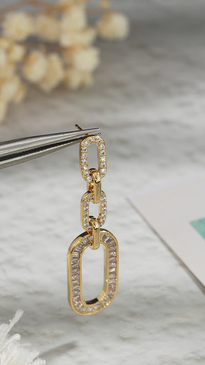 Inspired by modern minimalist jewelry and the symbolism of connection, these interlocking chain earrings drop blend baguette-cut CZ stones with a sleek silhouette. The cascading links create movement and light reflection with every step—making the design elegant while boldly contemporary.