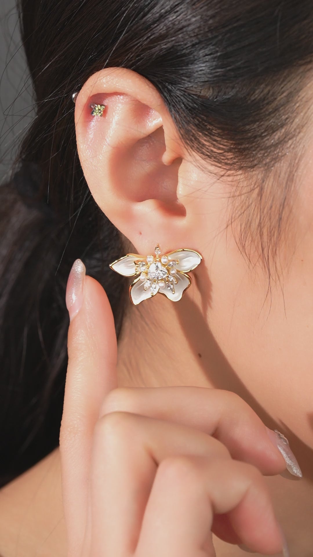 Inspired by naturally blooming petals, these earrings stud combine soft white enamel with refined gold outlines to create a delicate, dimensional floral silhouette.
