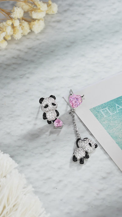 - Asymmetrical Composition: One side features a crystal-studded panda with a pink heart accent, while the other pairs a heart stud with a delicate chain and dangling panda.